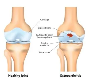 Arthritis is the inflammation of a joint. Osteoarthritis is the most common type of arthritis. It’s the destruction of cartilage pads along the joint surfaces. The joint cartilage (or articular cartilage) covers the bones’ ends and acts as a cushion and friction-free surface. It doesn’t have nerve endings or a blood supply, so it doesn’t feel any pain when traumatized. These cartilage pads can crack and become exposed to the subchondral bone over time. As the bone becomes thicker, bone spurs (technically known as osteophytes), form and joint inflammation occurs.