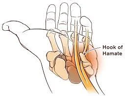 This is a fracture in the palm of your hand, opposite your thumb. This happens when the golf ball hits the ground. The symptoms include pain and tenderness in the palm of your hand. This condition can be ruled out by X-rays.